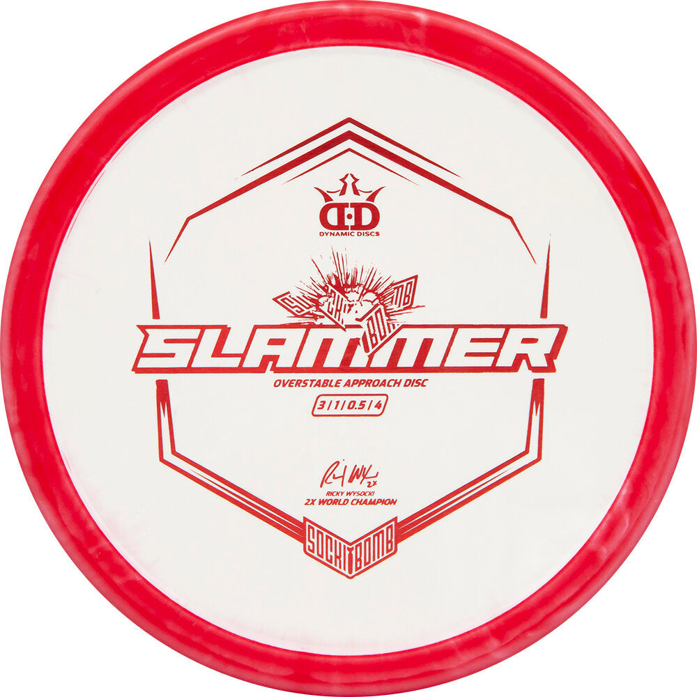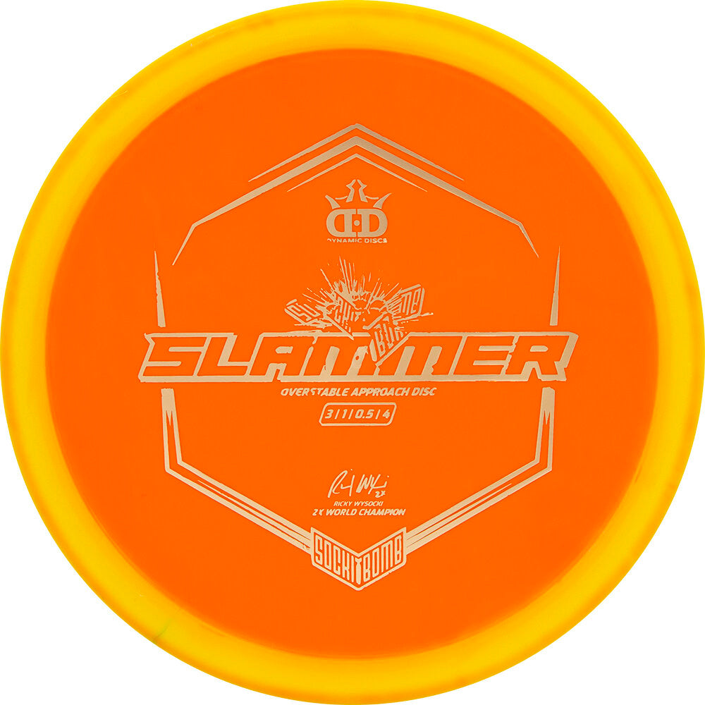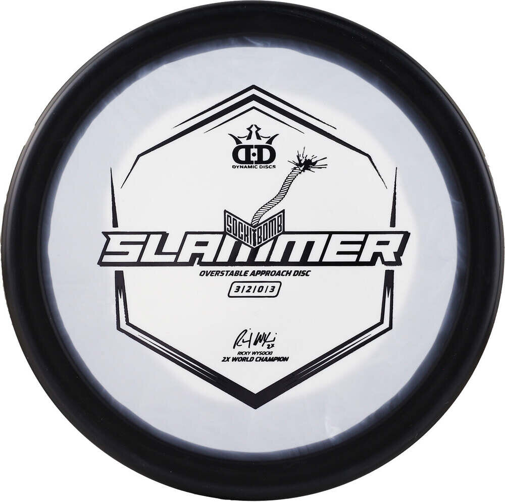 The Sockibomb Slammer is an all new mold based on the grip of the original Dynamic Discs Slammer and the consistency Ricky Wysocki loves in the Westside Discs Harp. The dependability of the Sockibomb Slammer is a must have for players of all skill levels and arm speeds. It is a super overstable throwing putter that can be thrown both backhand and forehand with a predictable finish every time, even into a strong headwind. It was created in collaboration with 2x World Champion Ricky Wysocki and is here to improve your approach game.