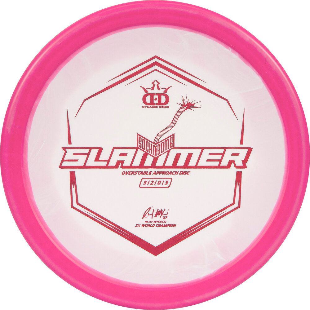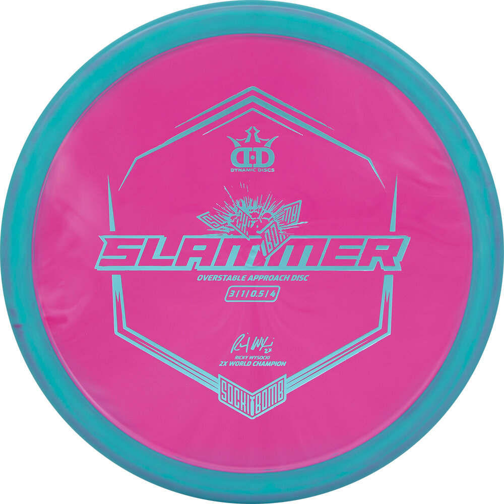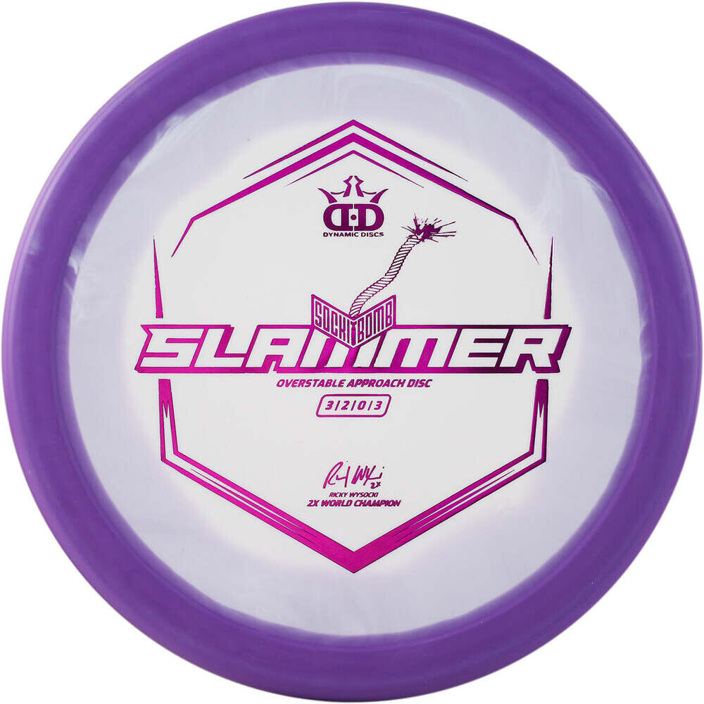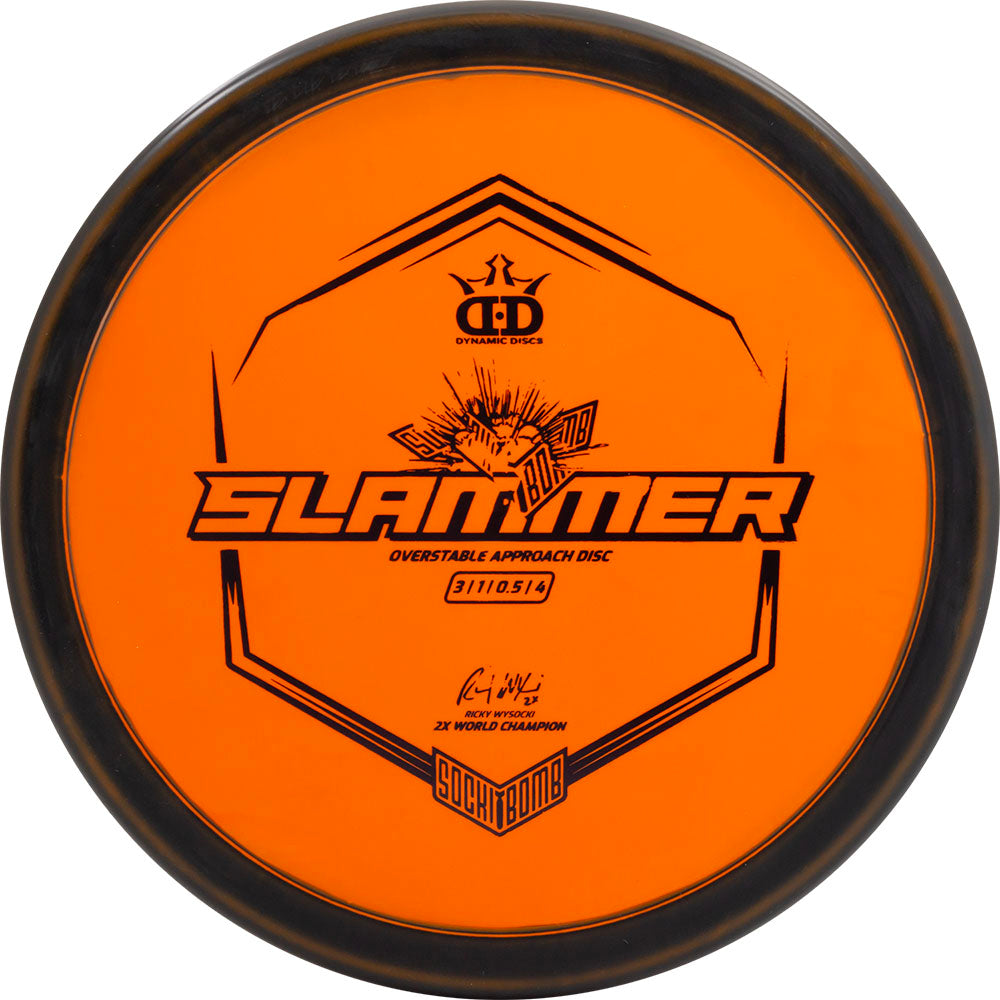 The Sockibomb Slammer is an all new mold based on the grip of the original Dynamic Discs Slammer and the consistency Ricky Wysocki loves in the Westside Discs Harp. The dependability of the Sockibomb Slammer is a must have for players of all skill levels and arm speeds. It is a super overstable throwing putter that can be thrown both backhand and forehand with a predictable finish every time, even into a strong headwind. It was created in collaboration with 2x World Champion Ricky Wysocki and is here to improve your approach game.