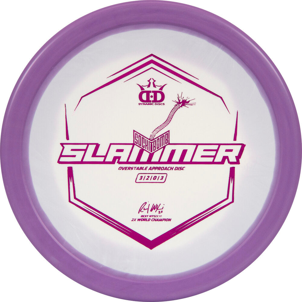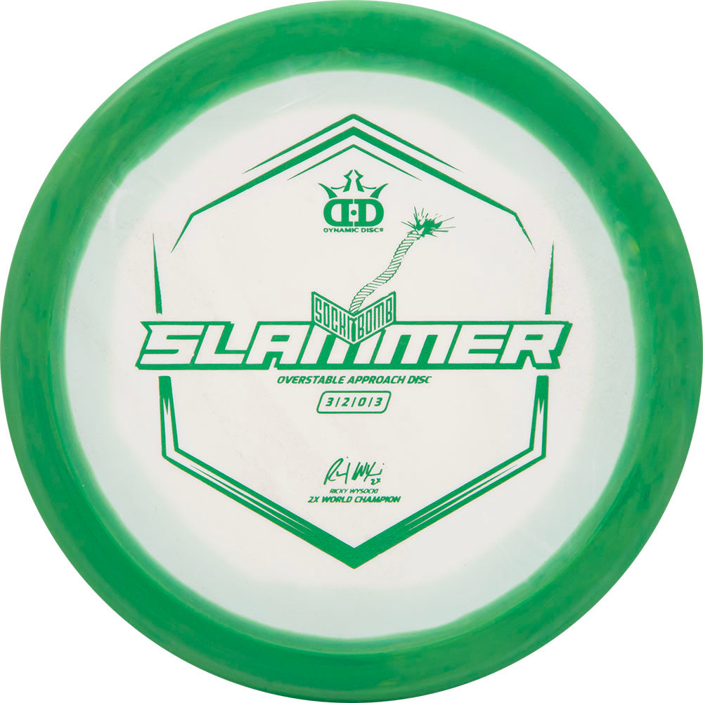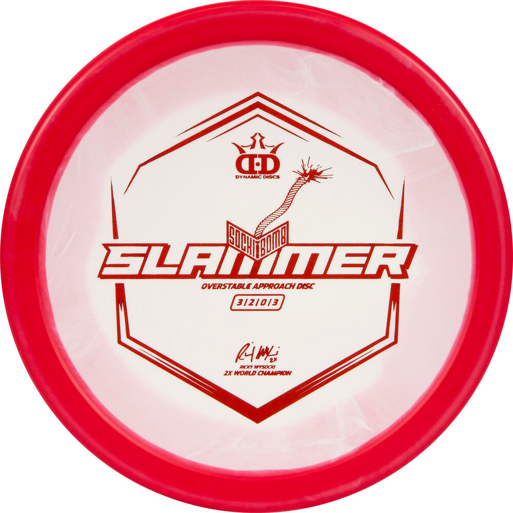 The Sockibomb Slammer is an all new mold based on the grip of the original Dynamic Discs Slammer and the consistency Ricky Wysocki loves in the Westside Discs Harp. The dependability of the Sockibomb Slammer is a must have for players of all skill levels and arm speeds. It is a super overstable throwing putter that can be thrown both backhand and forehand with a predictable finish every time, even into a strong headwind. It was created in collaboration with 2x World Champion Ricky Wysocki and is here to improve your approach game.