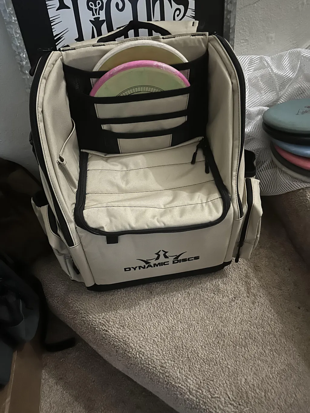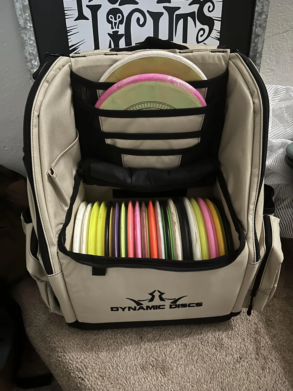 The Commander Cooler bag provides good disc storage with the added benefit of a built-in cooler. This bag can haul 10+ discs in the main compartment, 4+ discs in the vertical disc pockets, more discs or outer layers in the tall side pockets, and it still has room for a 6-pack in the insulated cooler pouch. With two additional water bottle holders on the side, the Commander Cooler ensures that you stay hydrated and have fun on the course!